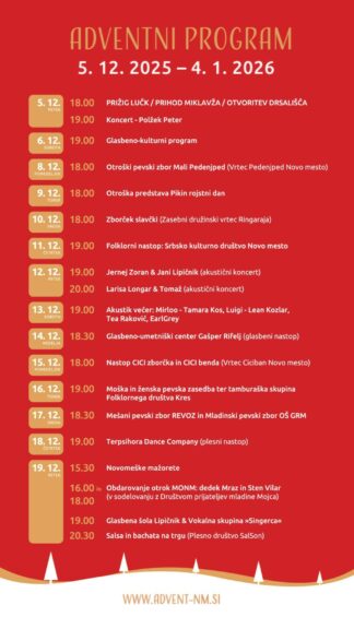 Advent v Novem mestu bo med 5. decembrom in 4. januarjem 2026 ponudil pester niz dogodkov z velikimi koncerti Jana Plestenjaka, skupine Siddharta, Žana Serčiča, MRFY, Vlada Kreslina in Mali bogovi, Dan D, Plutz ter ansambla Aufbiks. Dogajanje bodo dopolnili nastopi mešanih pevskih zborov, otroške predstave, obdarovanja, drsališče ter program lokalnih društev in kulturnih skupin.
