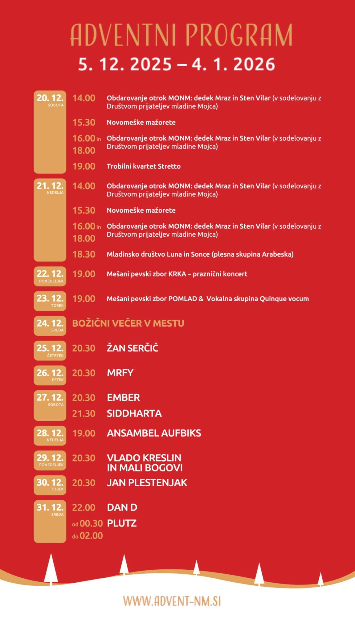 Advent v Novem mestu bo med 5. decembrom in 4. januarjem 2026 ponudil pester niz dogodkov z velikimi koncerti Jana Plestenjaka, skupine Siddharta, Žana Serčiča, MRFY, Vlada Kreslina in Mali bogovi, Dan D, Plutz ter ansambla Aufbiks. Dogajanje bodo dopolnili nastopi mešanih pevskih zborov, otroške predstave, obdarovanja, drsališče ter program lokalnih društev in kulturnih skupin.
