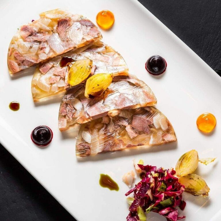 In una pentola grande mettiamo la testa di maiale, le zampe di maiale, la coda, le verdure per il brodo e le erbe aromatiche. Cuociamo per circa 2 ore. Poi nello stesso pentolone cuociamo i reni e i cuori di maiale, ben lavati, fino a quando sono morbidi (circa 1 ora in più). Separiamo gli alimenti cotti dall’acqua (che diventa una gelatina). Separiamo le ossa dalla carne delle teste e tagliamo il tutto a cubetti; stacchiamo la carne dalla coda; togliamo la carne dalle zampe e la tagliamo a cubetti; tagliamo il fegato e i reni a cubetti. Uniamo tutti gli ingredienti a base di carne in una ciotola più grande, li condiamo con sale, pepe, aglio tritato e li ricopriamo con il brodo in cui sono stati cotti. Versiamo il composto in forme a piacere o budella e facciamo raffreddare. La gelatina va tagliata a freddo. Si può servire con olio, aceto, marmellate, scalogno…