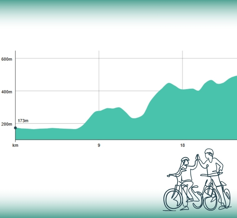 Teren se izmenjuje med dolino in hribovjem. Podlaga je raznolika – asfalt, makadam (fini in grobi) ter mestoma trava na krajših kolovozih – zato je trasa primerna za gravel in MTB kolesarjenje.