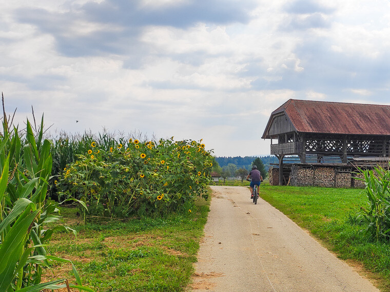 Pot nadaljujemo po asfaltirani cesti med zidanicami in vinogradi v smeri Dreganjih Sel. Iz Dreganjih Sel se spustimo po mirni, asfaltirani vinogradniški cesti do Dolenjih Sušic. Tam zavijemo desno proti Dolenjskim Toplicam, kjer priporočam krajši postanek. Nato nadaljujemo proti Meniški vasi. Pri osnovni šoli zavijemo desno v gozd na makadamsko pot, ki nas vodi ob avtokampu ob Balneji v smeri Gradišča. Po približno 200 metrih zavijemo desno na kolesarsko pot proti Rumanji vasi.